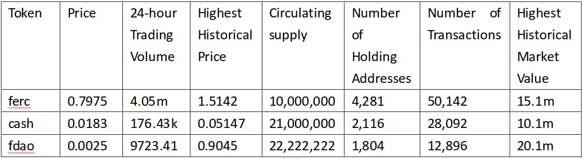 O token $FERC foi cunhado gratuitamente em 1º de junho e rapidamente atraiu a atenção da comunidade, atingindo um valor de mercado de US$ 15 milhões em seu pico. Se a taxa do gás de cunhagem for considerada como o custo, cerca de 5U por boleto (1000 moedas), a FERC aumentou cerca de 300 vezes. Seu surgimento estimulou o surgimento de uma série de tokens centrados no conceito de lançamento justo.