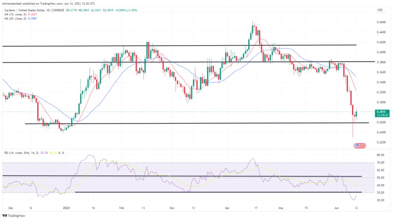 O par ADA/USD caiu mais de 30% nos últimos dias, caindo para um mínimo de US$ 0,2300 no processo.