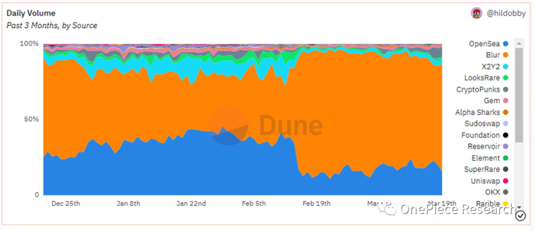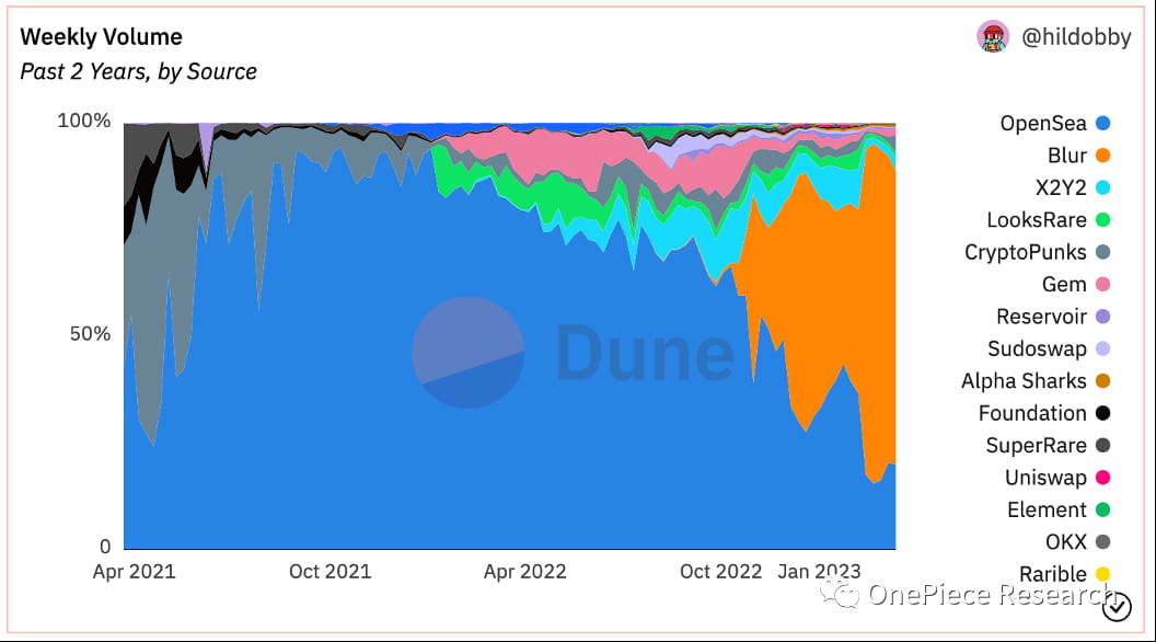 LooksRare e X2Y2 lançaram suas plataformas sequencialmente, lançando airdrops para usuários Opensea para obter tráfego inicial. Posteriormente, introduziram as suas próprias recompensas de mineração num esforço para conquistar quota de mercado. No entanto, a redução persistente dos mecanismos de recompensa levou, em última análise, a uma diminuição sustentada do volume real de negociação.