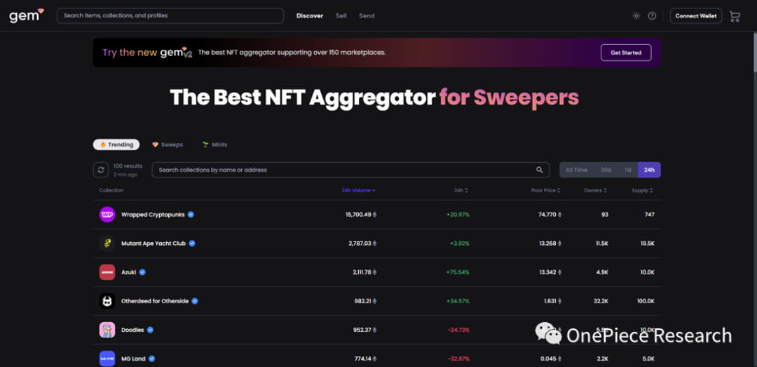 Gem, o principal agregador de NFT antes do lançamento do Blur, oferece uma plataforma que permite aos usuários explorar NFTs de diversos mercados. Semelhante ao Blur, o Gem consolida o tráfego de vários mercados NFT convencionais, facilitando compras em massa com boa relação custo-benefício. Isso permite que os usuários garantam negócios ideais e, ao mesmo tempo, direcionem tráfego e receita para a Gem. Servindo como um canal, a Gem redireciona usuários de vários mercados e plataformas NFT para sua própria plataforma, estabelecendo-se potencialmente como um hub central para agregar tráfego NFT substancial. Em abril de 2022, a Opensea adquiriu a Gem, permitindo-lhe operar de forma independente dentro do ecossistema Opensea. Esta integração fornece à Gem acesso aos recursos da Opensea, preservando suas características distintivas e serviços adaptados a diversos usuários. Como parte da Opensea, a Gem está estrategicamente posicionada para atender a base de usuários da Opensea, expandir sua influência e aumentar sua participação no mercado.