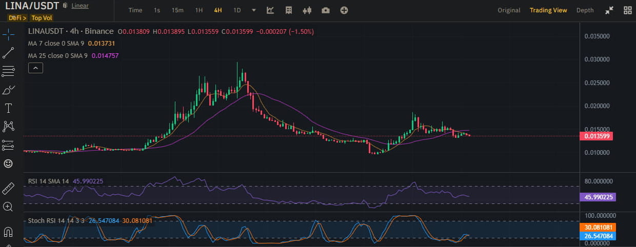 Em grandes períodos de tempo, o RSI e o Stoch RSI foram corrigidos, por exemplo, no período 4H, o RSI e o Stoch RSI estão sobrevendidos e mostram sinais de alta. A imagem acima mostra o RSI e o Stoch RSI, há uma situação de sobrevenda, os vendedores estão ficando mais fracos, o RSI (46) e o Stoch RSI (30) se moveram para cima, reforçando o potencial de alta para o LINA.