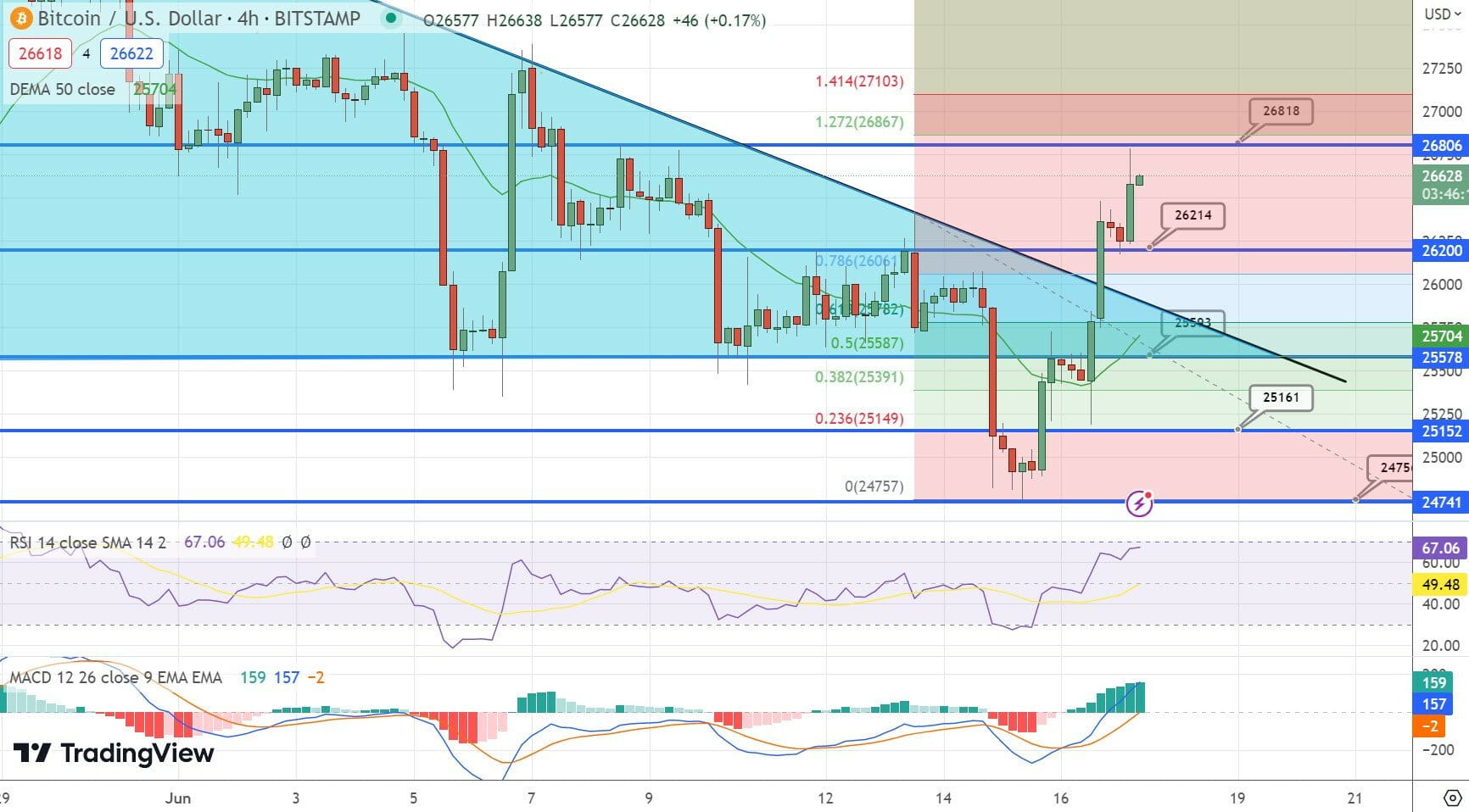Além disso, o Bitcoin atingiu uma alta em torno de US$ 26.800 e experimentou uma pequena correção negativa, encontrando suporte na resistência testada anteriormente de US$ 26.250, que atualmente atua como um nível de suporte. Portanto, é provável que o BTC continue sua tendência de alta, visando a próxima resistência em US$ 27.100 e talvez mais.