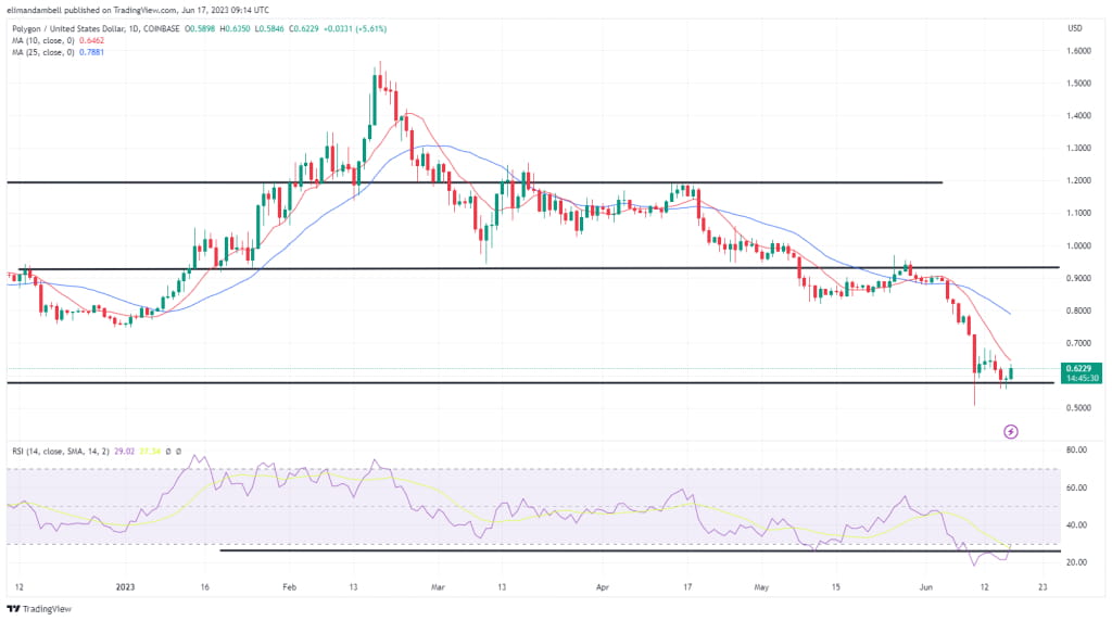 O par MATIC/USD atingiu uma máxima intradiária de US$ 0,6302 no início do fim de semana, um dia após cair para uma mínima de US$ 0,5624.