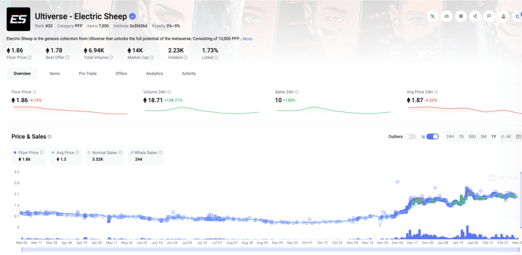 Electric Sheep NFT, como o primeiro ativo do ecossistema Ultiverse e um de seus principais ativos, tem um fornecimento total de 7.000. Lançado em julho de 2022 a 0,5 ETH, seu preço mínimo agora gira em torno de 2 ETH, proporcionando aos detentores retornos quádruplos em ETH e óctuplo em USD, fortalecendo significativamente a sua base comunitária. Os detentores de Electric Sheep obtêm acesso antecipado e recompensas aumentadas em vários projetos do ecossistema Ultiverse, além de serem elegíveis para lançamentos aéreos do token de governança do Ultiverse, $ULTC.