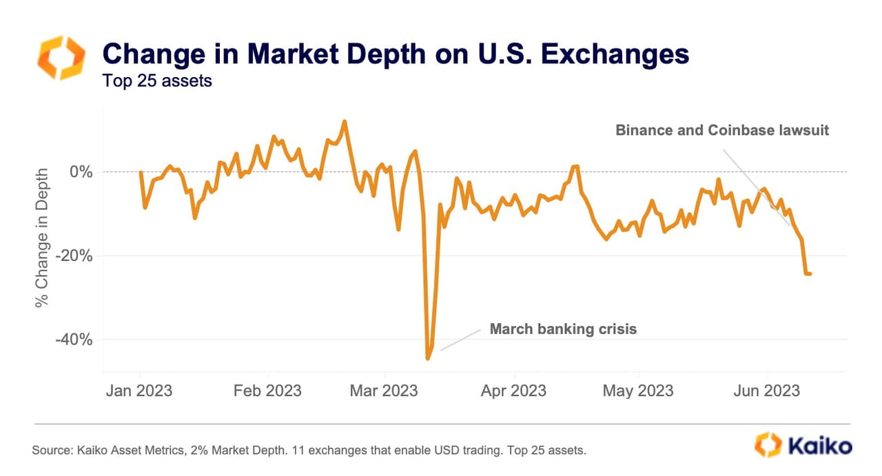 Mudanças na profundidade de mercado das bolsas de criptomoedas dos EUA desde o início de 2023. Fonte: Kaiko