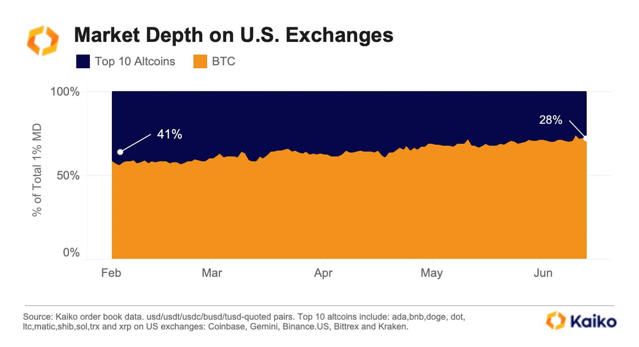 Mudanças na profundidade do mercado de altcoins e BTC de bolsas de criptomoedas dos EUA de fevereiro a junho de 2023. Fonte: Kaiko