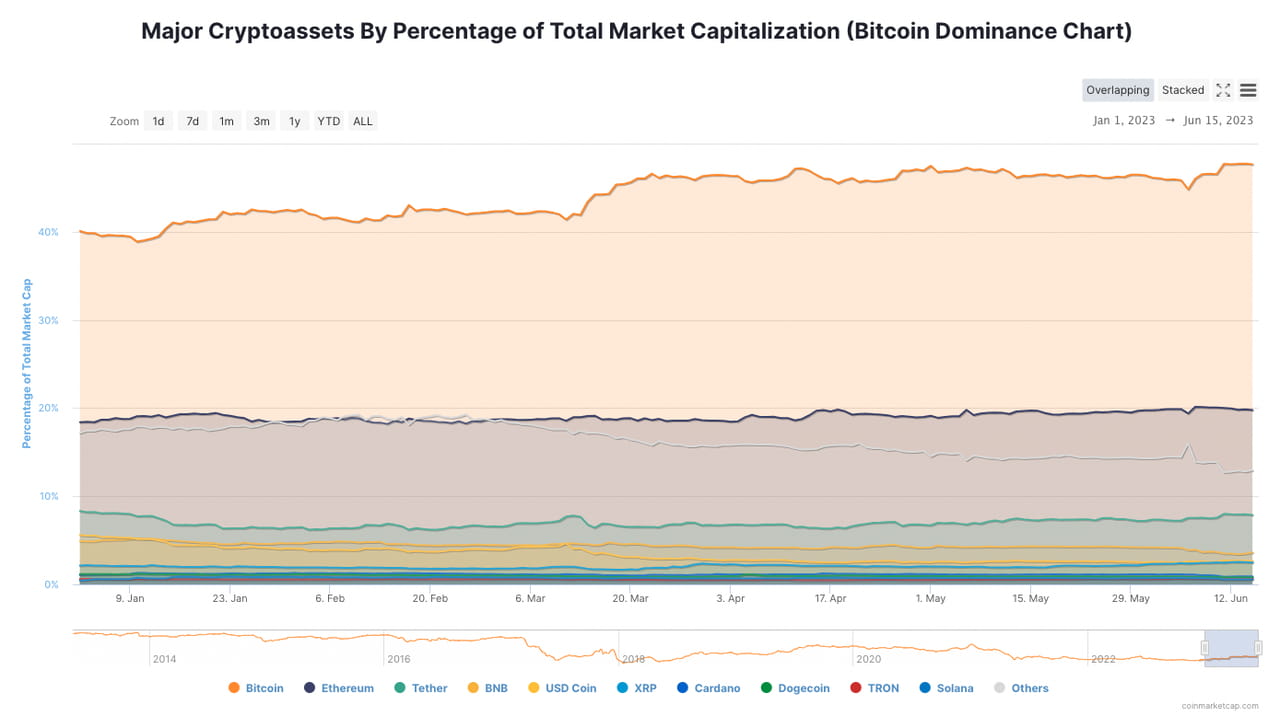 Mudanças na participação de mercado dos principais criptoativos, em junho de 2023. Fonte: Coinmarketcap