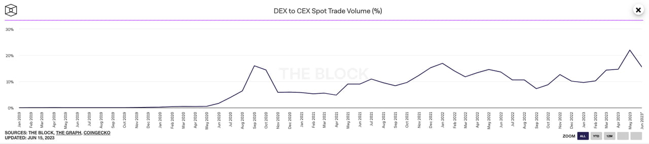 Comparação do volume de negociação à vista de bolsas descentralizadas e centralizadas, em junho de 2023. Fonte: The Block