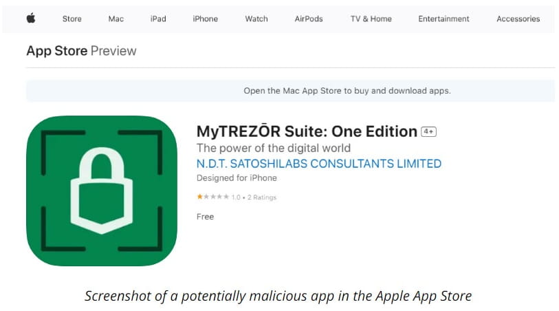 Aplicativos de carteira falsos na App Store da Apple não são nenhuma novidade. Em 2021, um usuário teria perdido US$ 600.000 em Bitcoin após baixar um aplicativo malicioso da Trezor na App Store.