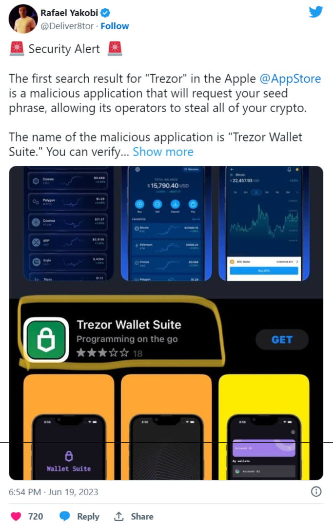 Em 20 de junho, o sócio-gerente da Crypto Lawyers, Rafael Yakobi, postou um alerta de segurança sobre a App Store da Apple. Yakobi relatou que o primeiro resultado de uma pesquisa por “Trezor” foi um aplicativo malicioso projetado para roubar criptomoedas.