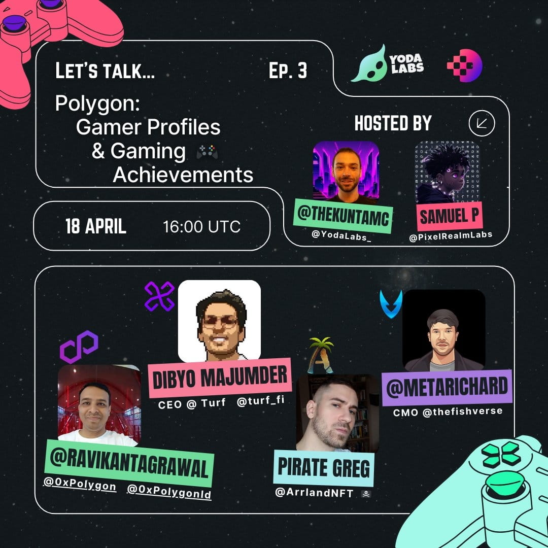 Vamos conversar... Ep.3🎙 "Gamer Profiles & Achievements" Apresentando: 👾@ravikantagrawal, @0xPolygon @0xPolygonID 👾 @MajumderDibyo, @turf_fi 👾 Pirate Greg, @ArrlandNFT 👾 @metarichard, @TheFishverse com os anfitriões @TheKuntaMC e @samuel_plesnik Lembretes ativados! ⏰ 👉🏼 https://t.co/FVd8MFeDuj