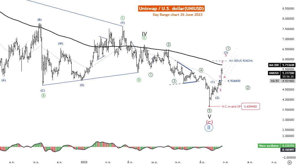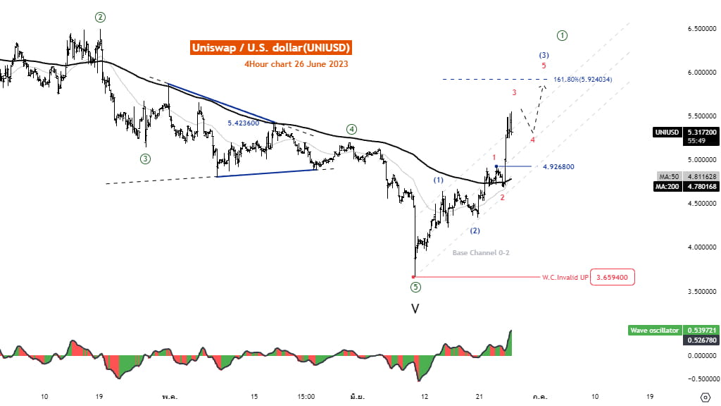 Indicadores técnicos Uniswap/dólar americano (UNIUSD): O preço está acima da MA200, indicando uma tendência de alta, o oscilador de onda tem um momentum de alta