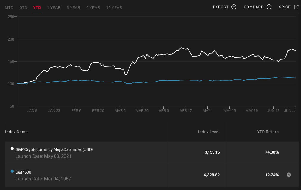 Movimento do S&P Cryptocurrency MegaCap Index e S&P 500 Index desde 2023, em 28 de junho de 2023. Fonte: S&P Global