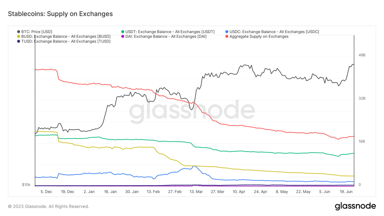 Mudança no fornecimento de stablecoins nas bolsas, em 28 de junho de 2023. Fonte: glassnode