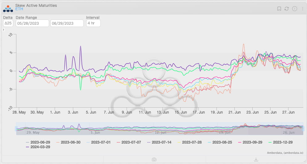 Mudança na inclinação das opções de ETH por vencimentos, em 28 de junho de 2023. Fonte: Amberdata Derivatives