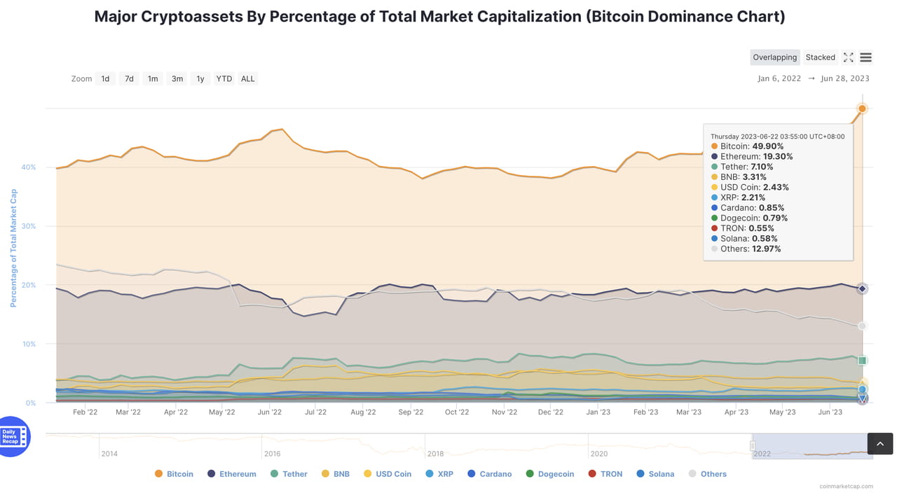 Gráfico de dominância do Bitcoin, em 28 de junho de 2023. Fonte: CoinMarketCap