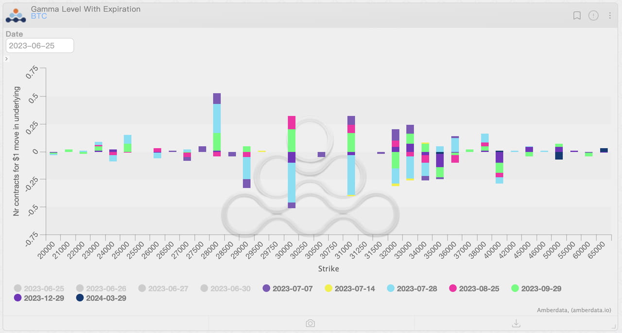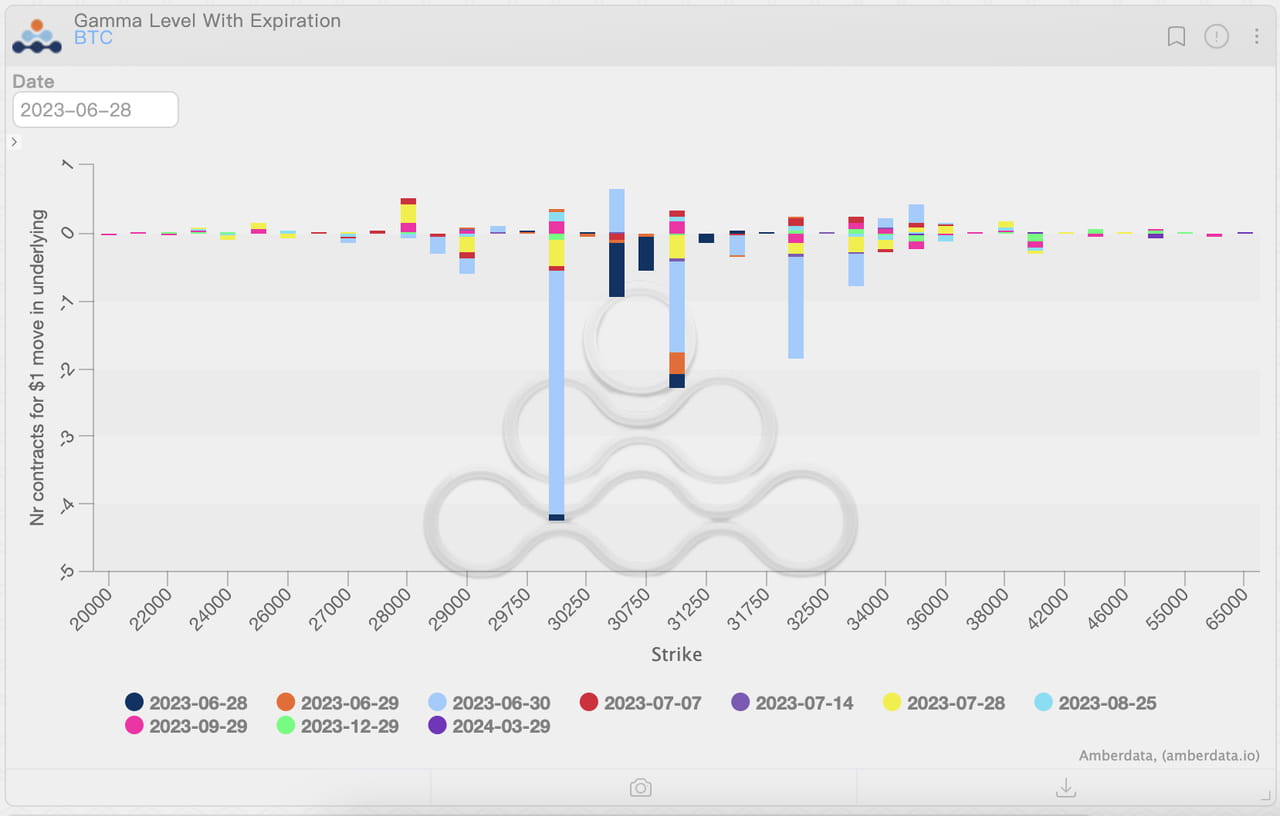 Distribuição de exposição gama de opções BTC, em 28 de junho de 2023. Fonte: Amberdata Derivatives