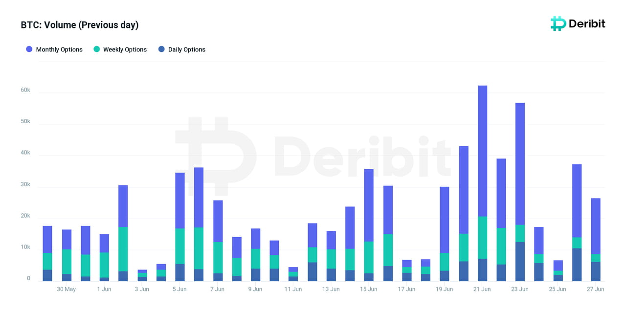Volume diário de negociação de opções de BTC na bolsa Deribit, em 28 de junho de 2023. Fonte: Deribit Metrics
