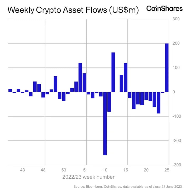 Entrada/saída líquida semanal de fundos de instituições de gestão de criptoativos, em 28 de junho de 2023. Fonte: Coinshares