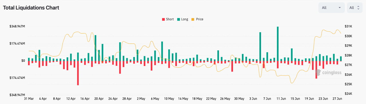 Mudança na escala de liquidação de derivativos Delta 1 durante o 2º trimestre de 2023, em 28 de junho de 2023. Fonte: Coinglass