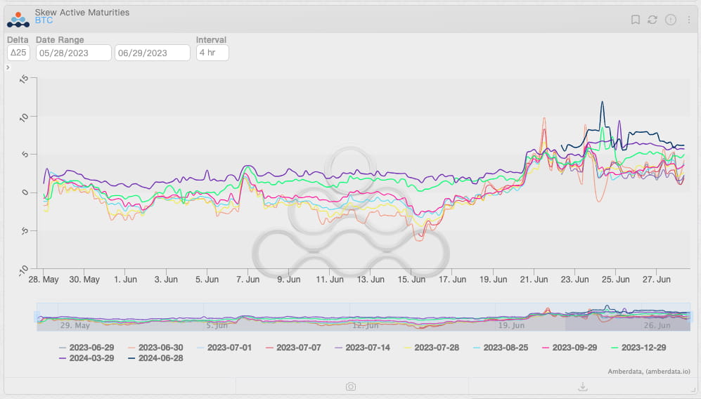 Mudança na inclinação das opções de BTC por vencimentos, em 28 de junho de 2023. Fonte: Amberdata Derivatives