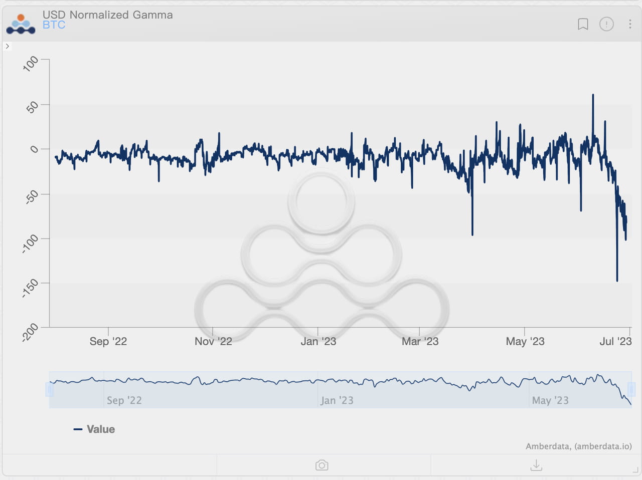 Movimento do nível gama do dólar das opções BTC, em 28 de junho de 2023. Fonte: Amberdata Derivatives