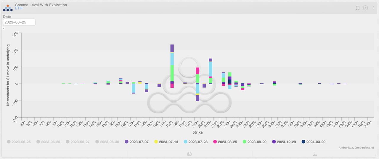 Distribuição da exposição gama das opções ETH após a liquidação, em 28 de junho de 2023. Fonte: Amberdata Derivatives