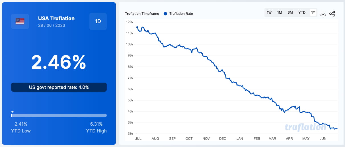 Inflação em tempo real nos EUA, em 28 de junho de 2023. Fonte: truflation.com