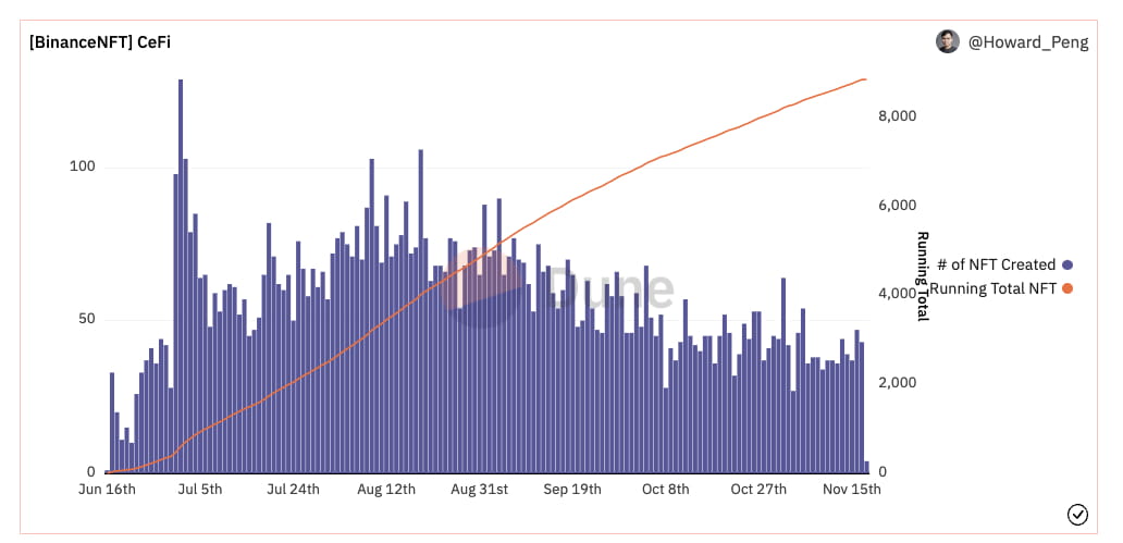 Hoje vamos compartilhar com vocês os dados do Binacne NFT. Se você notou, você poderia criar NFT sem problemas em Binance.com. É um sistema híbrido CeFi/DeFi em que você pode pagar o BNB originalmente em sua conta Binance, mas gerar uma coleção NFT na cadeia na cadeia BNB.