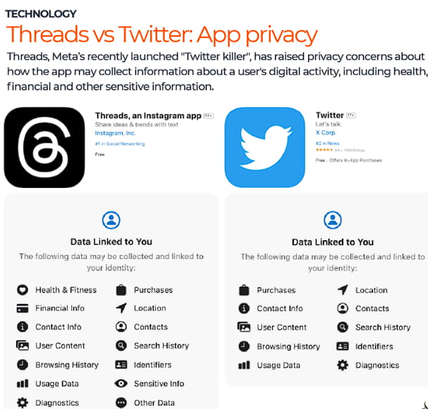 Threads pode oferecer uma atualização na experiência do Twitter, mas a privacidade de seus usuários é significativamente menos protegida do que na plataforma de seu rival.