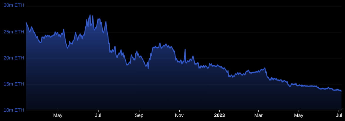 O valor total bloqueado (TVL), que mede os depósitos bloqueados nos contratos inteligentes da Ethereum, atingiu seu nível mais baixo desde agosto de 2020. O indicador caiu 3,1%, para 13,7 milhões de ETH, nos 30 dias anteriores a 4 de julho, segundo DefiLlama.