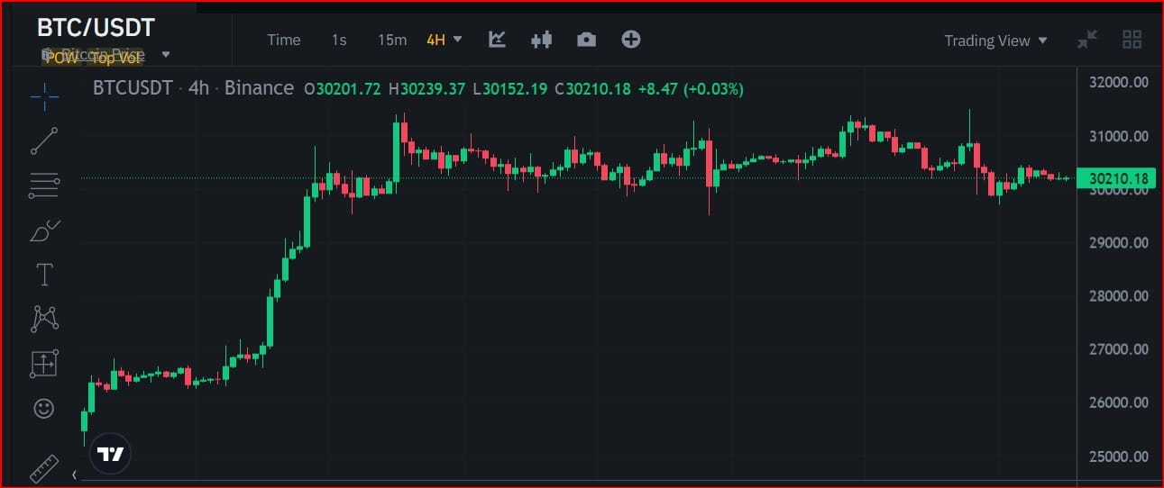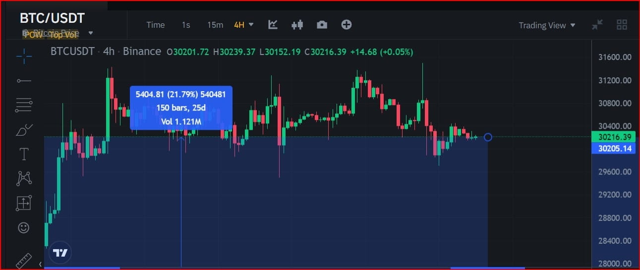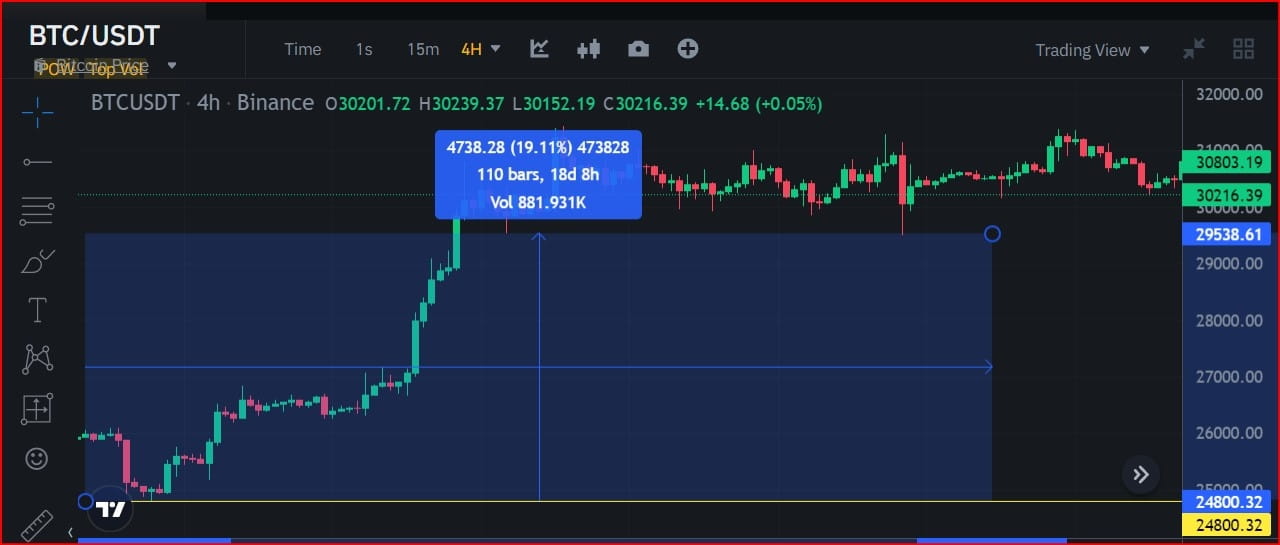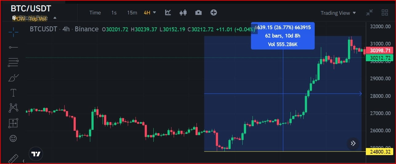 E a partir do preço mais baixo, a ação do preço do par de criptomoedas BTC/USDT saltou 26,7 7%