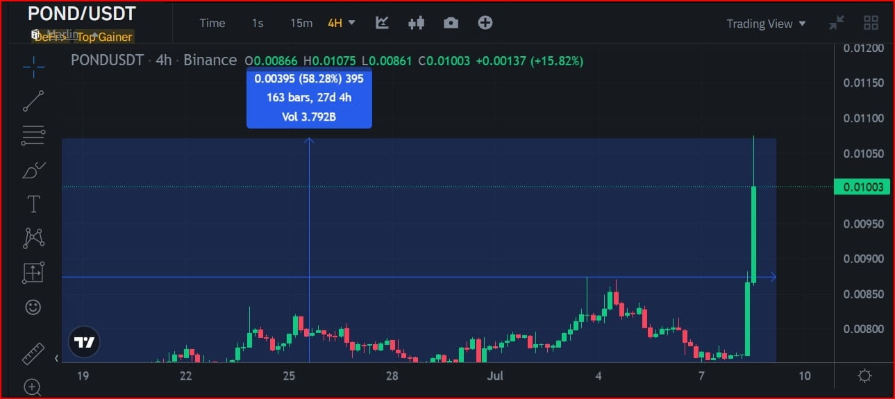 E finalmente, em 27 dias e 4 horas, o par de criptomoedas POND/USDT subiu 58,28% e você teria lucrado mais de 30% negociando somente essa moeda em particular.