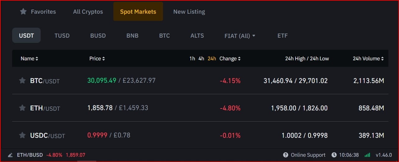 Agora clique no link do mercado à vista e selecione a criptomoeda base de sua escolha, como: USDT, TUSD, BUSD, BNB, BTC, ALTS e FIAT (TODOS).