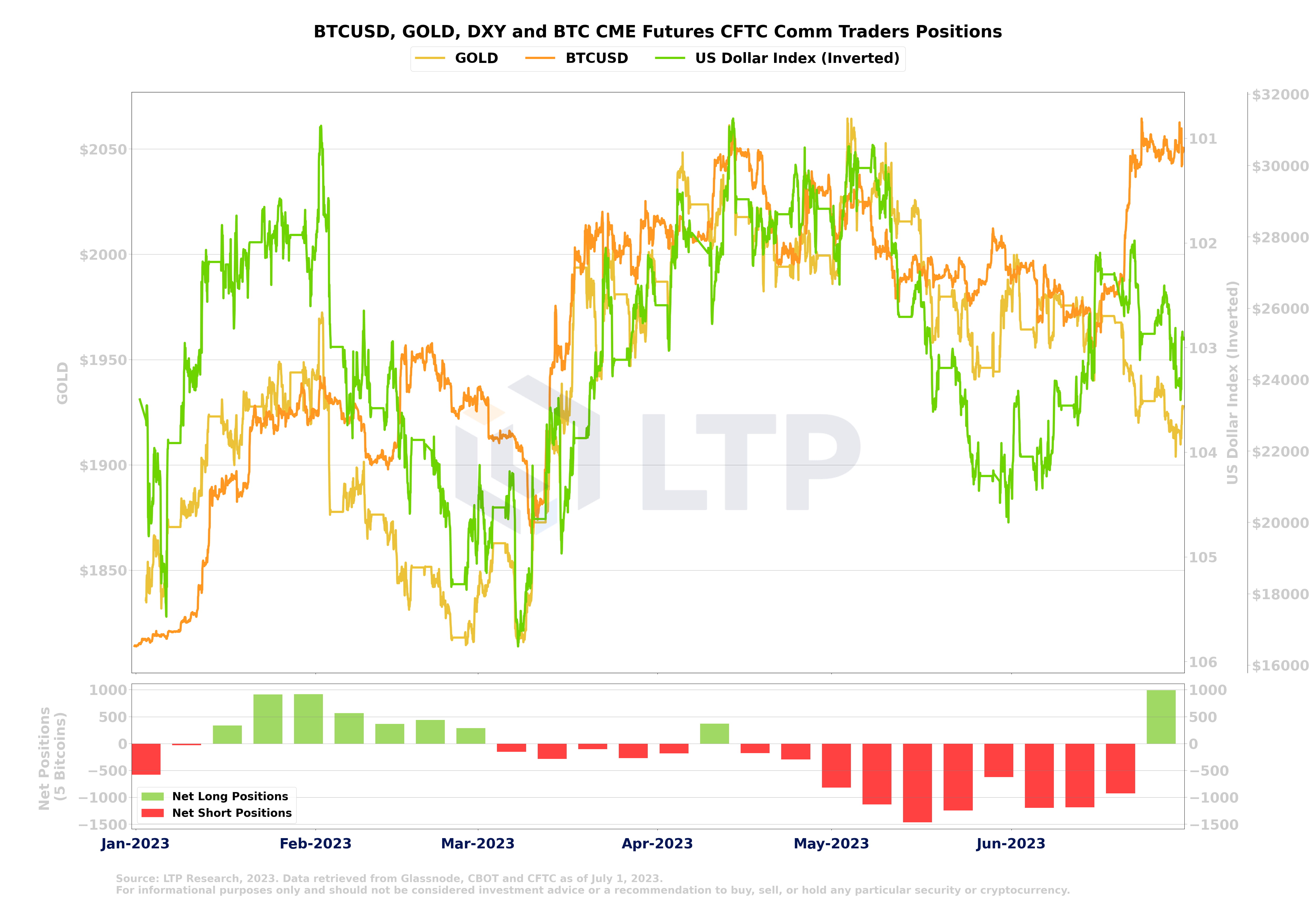 Em junho, os traders comerciais na plataforma de negociação CME para futuros de Bitcoin fecharam suas posições curtas e mudaram para posições longas líquidas no final do mês. Essa mudança no sentimento pode ser atribuída a vários catalisadores otimistas, incluindo notícias sobre a adoção do Bitcoin pelas finanças tradicionais, que foram relatadas em meados de junho.