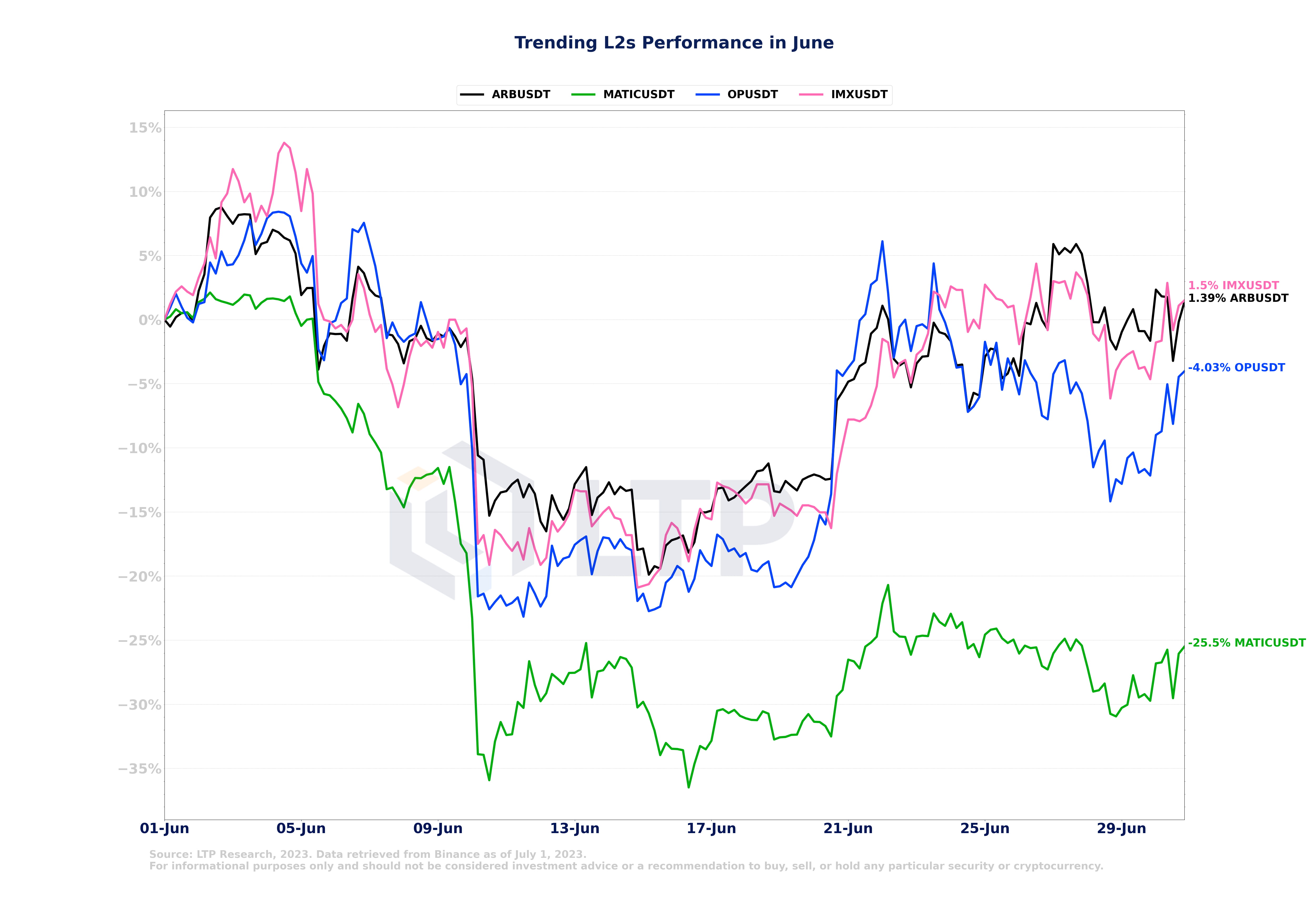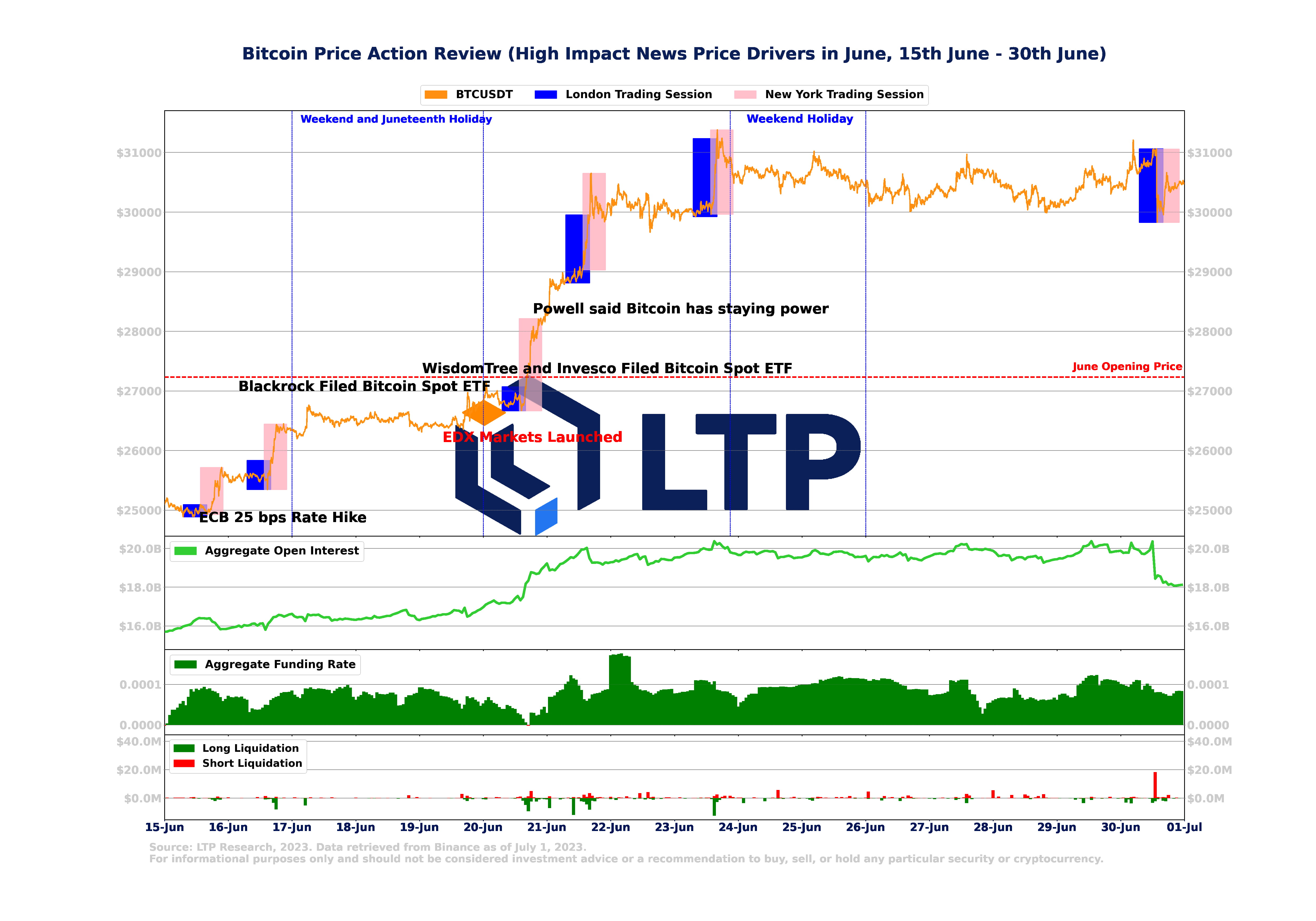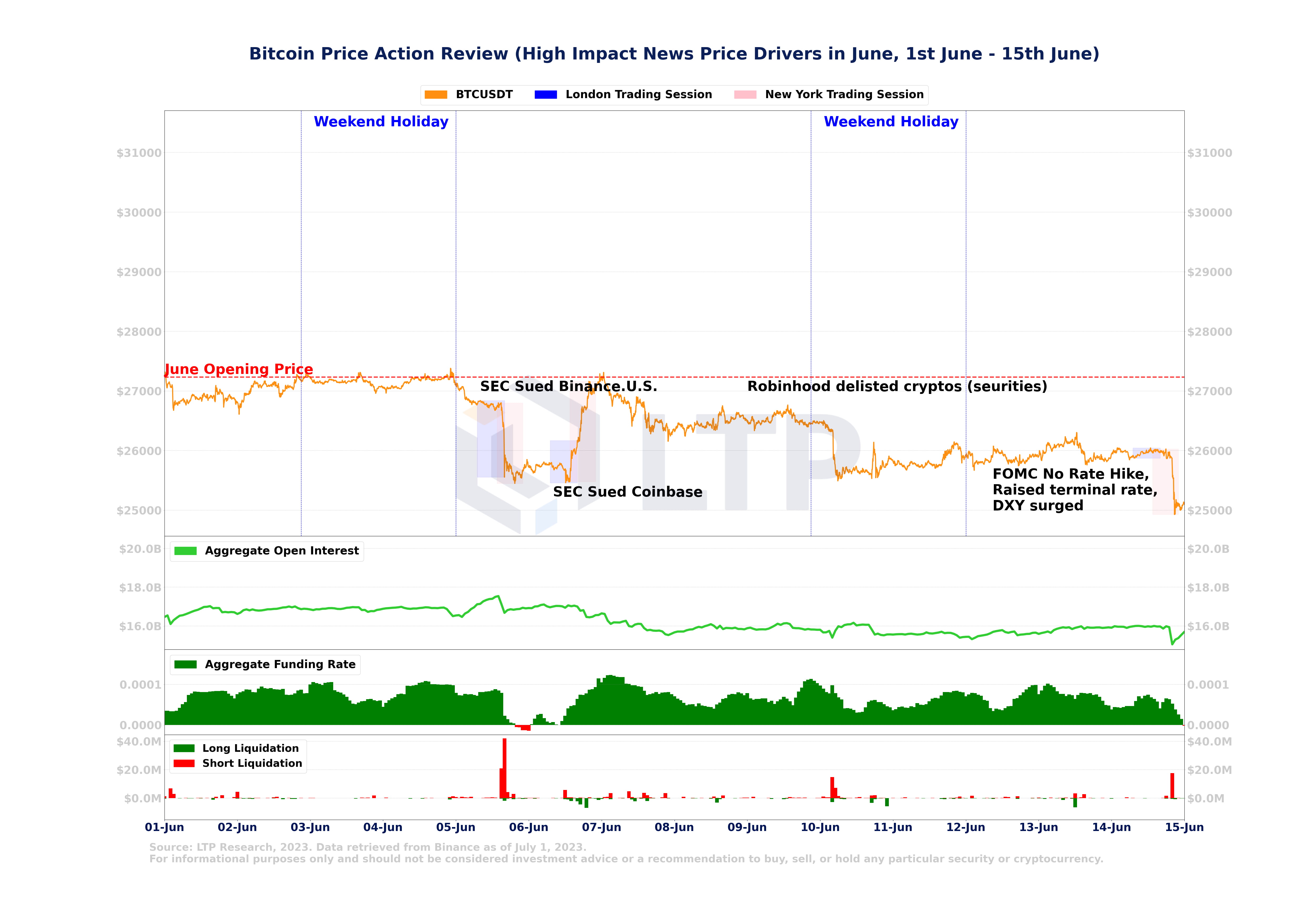 Em junho, vários eventos significativos impactaram a indústria de ativos digitais, além das decisões sobre taxas de juros do FOMC e do BCE. Em 6 e 7 de junho, a SEC processou a Binance.US e a Coinbase por ofertas de títulos não registrados e, mais tarde, a Robinhood retirou da lista várias criptomoedas em resposta ao processo, desencadeando liquidações.