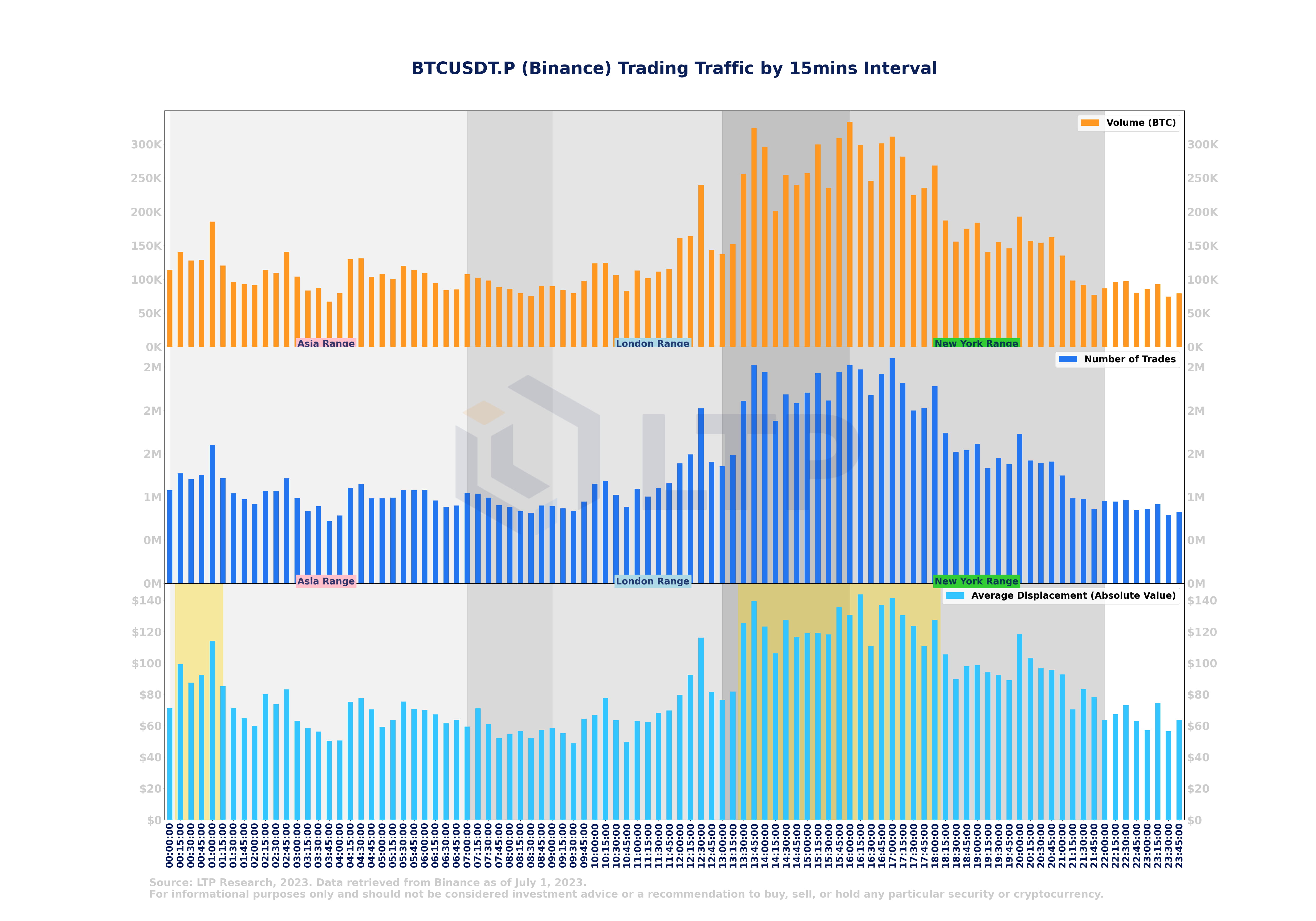 Durante junho, o período de negociação mais movimentado para Bitcoin ocorreu entre 13:30 e 18:00 (UTC), o que corresponde ao fechamento da Sessão de Negociação de Londres e à abertura da Sessão de Negociação de Nova York. Este período também apresentou um aumento significativo no deslocamento de preços, com o maior deslocamento médio de US$ 143,6 durante 16:30 e 16:45 (UTC). Isso representa uma janela para os comerciantes capturarem a volatilidade e os movimentos de preços.