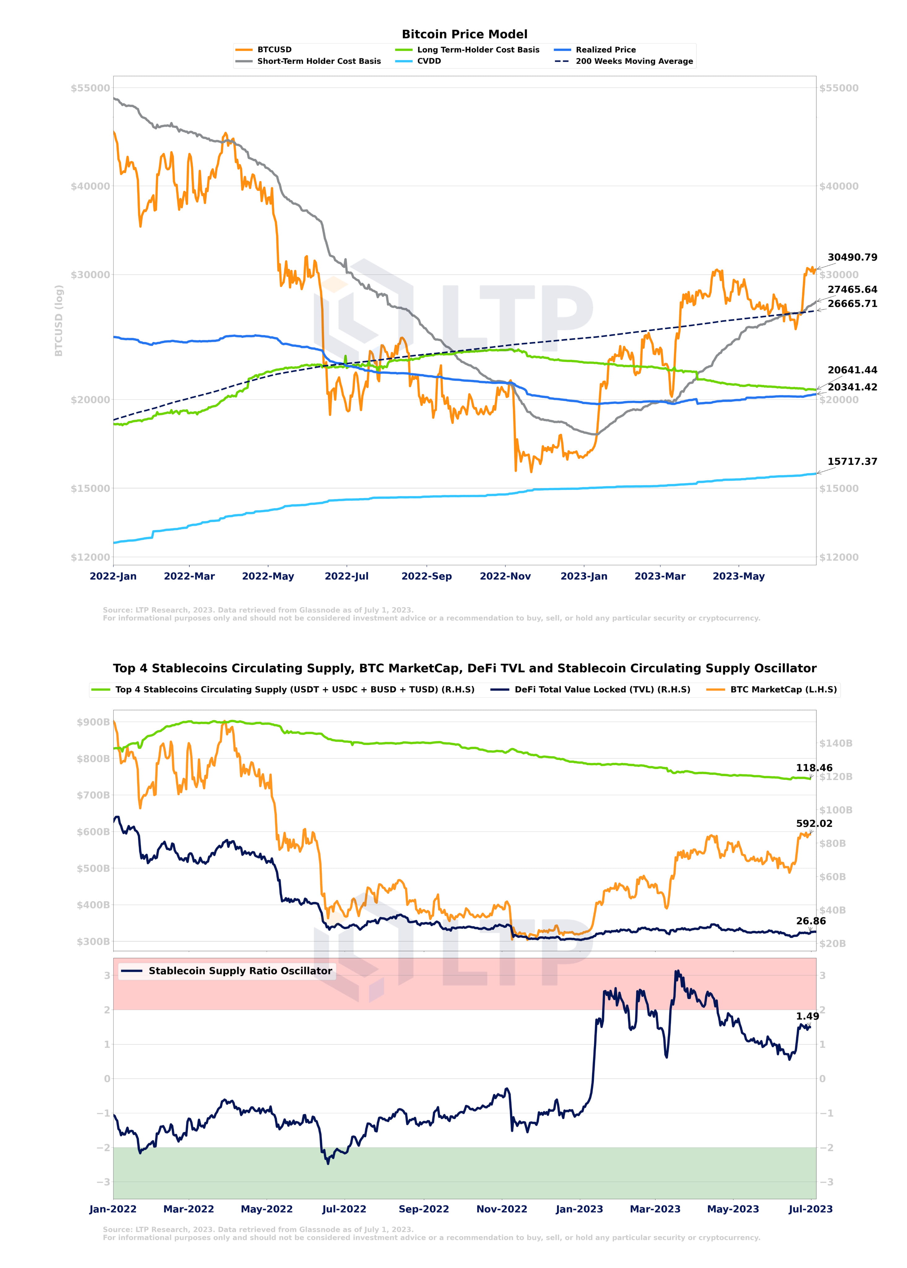 Em junho, o preço do Bitcoin se defendeu e mostrou forte suporte na média móvel de 200 semanas e na base de custo do detentor de curto prazo, resultando em uma tendência de alta contínua. Isso se deveu em grande parte às notícias otimistas dentro do setor.