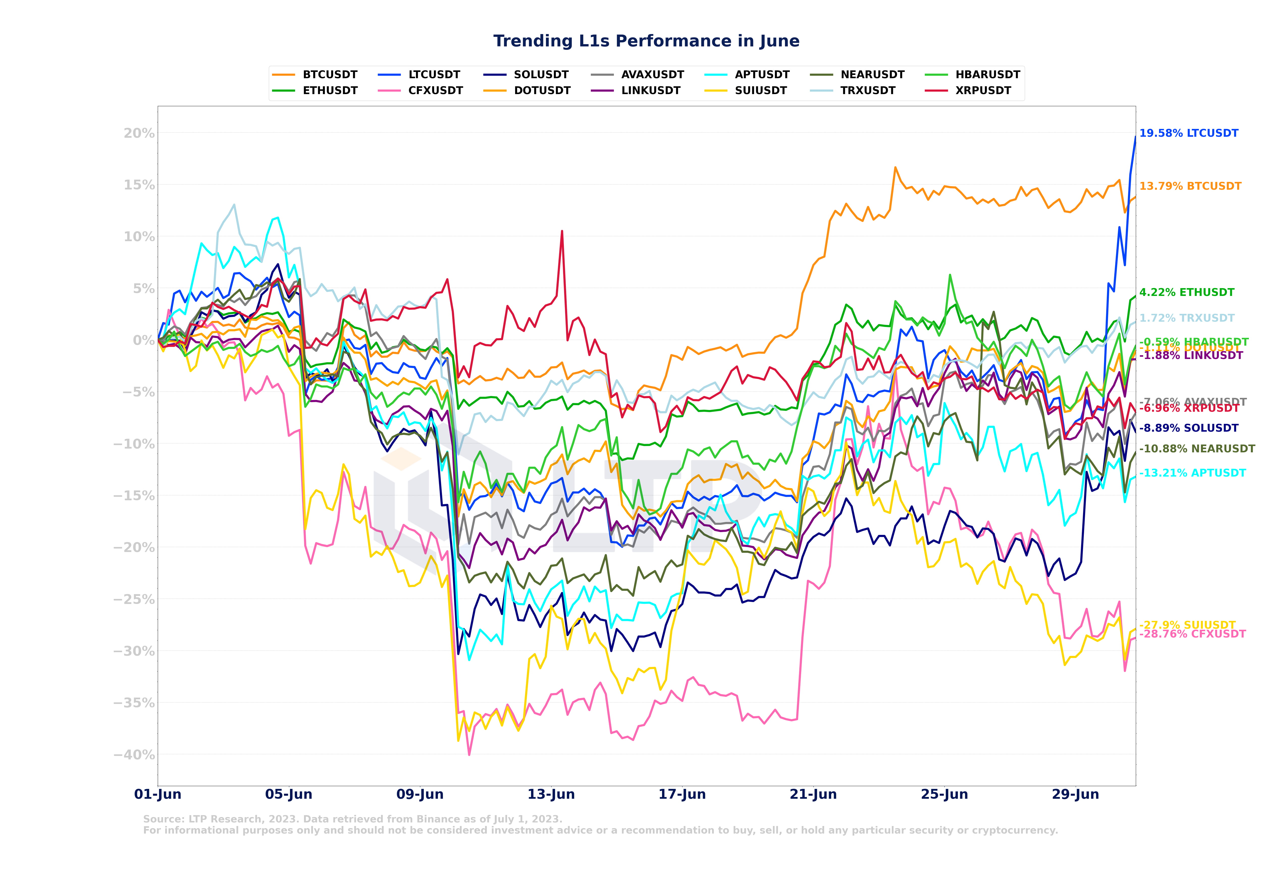 Curiosamente, em junho, apenas Bitcoin ($ BTC), Bitcoin Cash ($ BCH), Litcoin ($ LTC), Ethereum ($ ETH) e Tron ($ TRX) registraram aumentos de preço positivos, enquanto a maioria das altcoins registrou aumentos negativos. Isso pode ser atribuído ao processo da SEC contra a Binance.U.S. e Coinbase para ofertas de títulos não registrados e listagem de mais altcoins como títulos, o que criou incerteza e medo no mercado de altcoins.