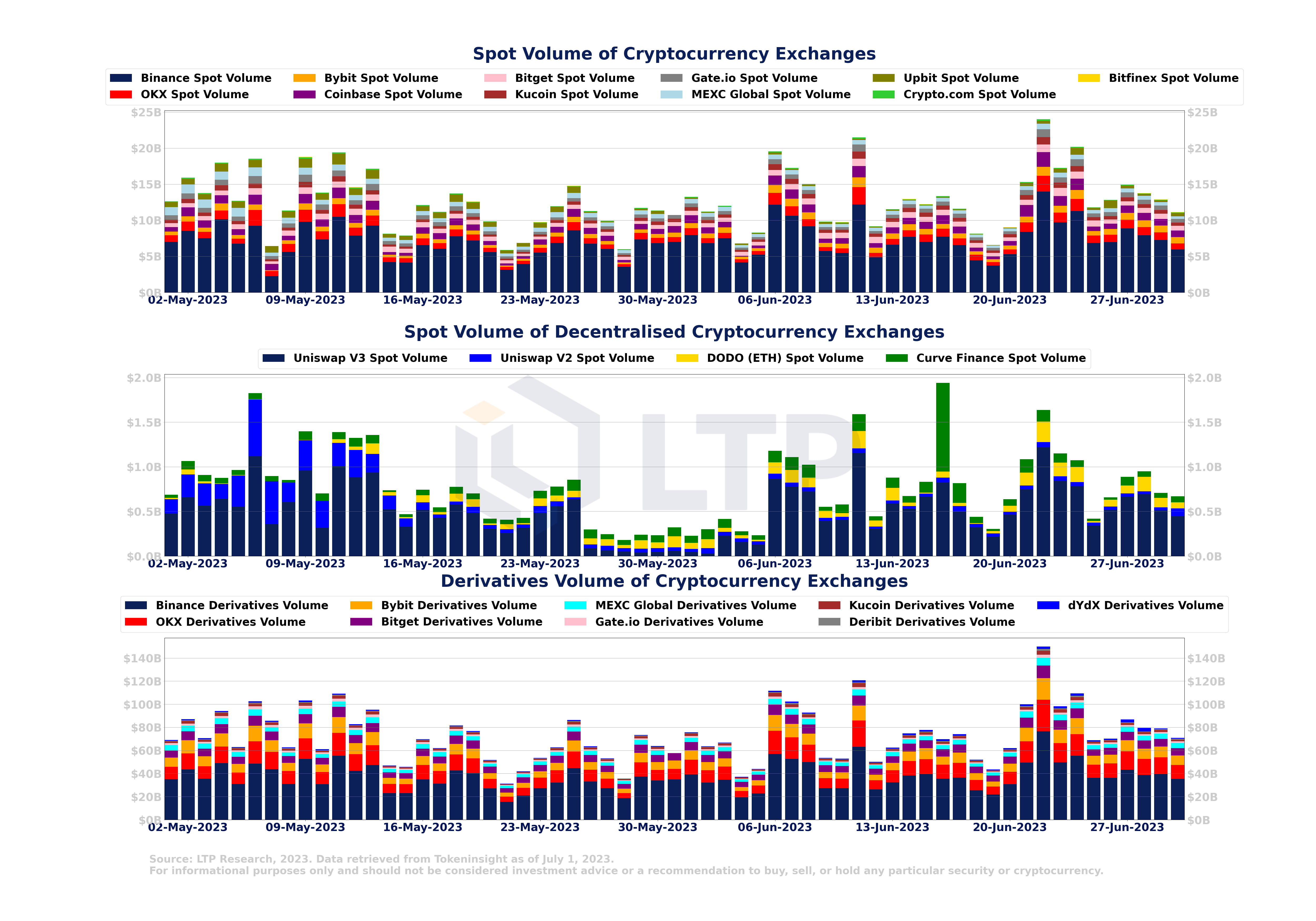 Esses eventos injetaram uma grande volatilidade nas criptomoedas, fazendo com que o $BTC atingisse uma alta anual acima de US$ 30.000. O volume agregado de negociações entre as bolsas populares aumentou significativamente em junho em comparação a maio. O $BCH foi o maior ganhador em junho, com um aumento impressionante de 170% no preço. O $LTC também apresentou desempenho superior no final de junho, à medida que seu halving se aproxima no início de agosto.