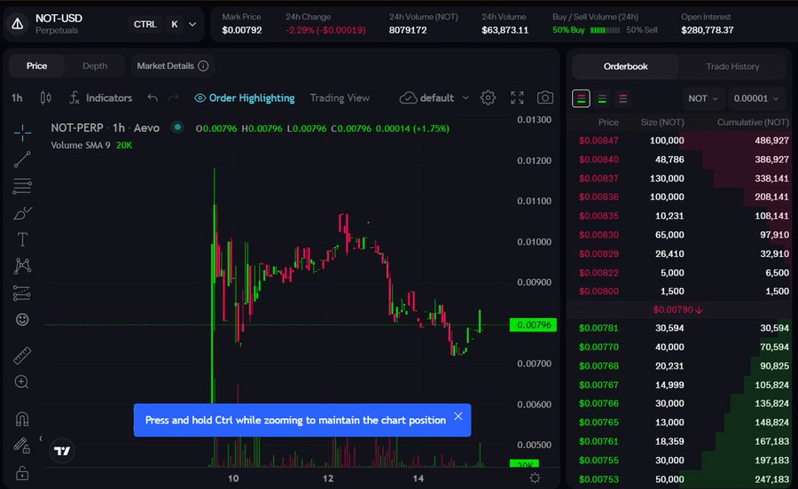 Atualmente o projeto está sendo negociado na Aevo ao preço de US$ 0,007x - Confira o link aqui https://app.aevo.xyz/perpetual/not