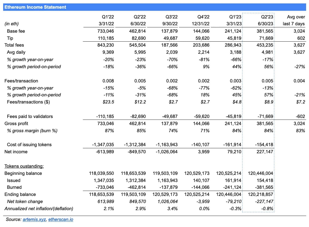 Calculado a partir do momento da introdução oficial do ETH no PoS, de 2022t4 a 2023t2, o lucro líquido total (USD) da rede Ethereum é: (3.959 * 1.301) + (79.210 * 1.589) + (227.147 * 1.861) = $ 553.735.916, equivalente a um lucro líquido anualizado de aproximadamente US$ 738.314.555;