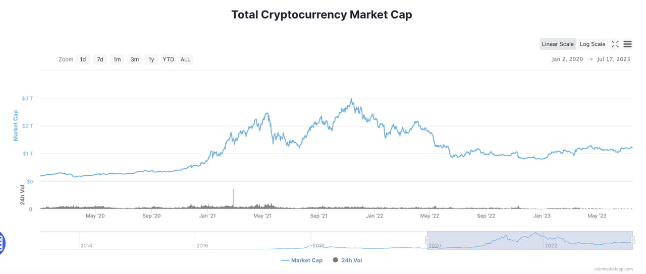 No momento da taxa de juros de 0%, a capitalização de mercado total do mercado criptográfico é de cerca de US$ 3T. Num momento com uma taxa de juros de 5,25%, o valor total de mercado do mercado de criptografia caiu para cerca de US$ 1,20 trilhão, cerca de 40% do ponto mais alto. Entre novembro de 2021 e março de 2022, o mercado de criptografia perdeu quase US$ 1 trilhão em capitalização de mercado devido à gestão de expectativas do Fed. Em março, o Fed aumentou as taxas de juros em 25 bps, momento em que o valor total de mercado do mercado criptográfico era de cerca de US$ 2T, 67% do ponto mais alto.