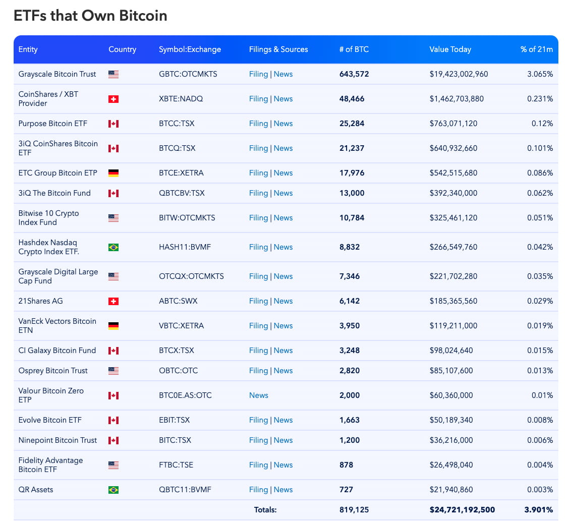 Lista de ETFs Bitcoin, em 17 de julho de 2023. Fonte: Bitcoin Treasuries