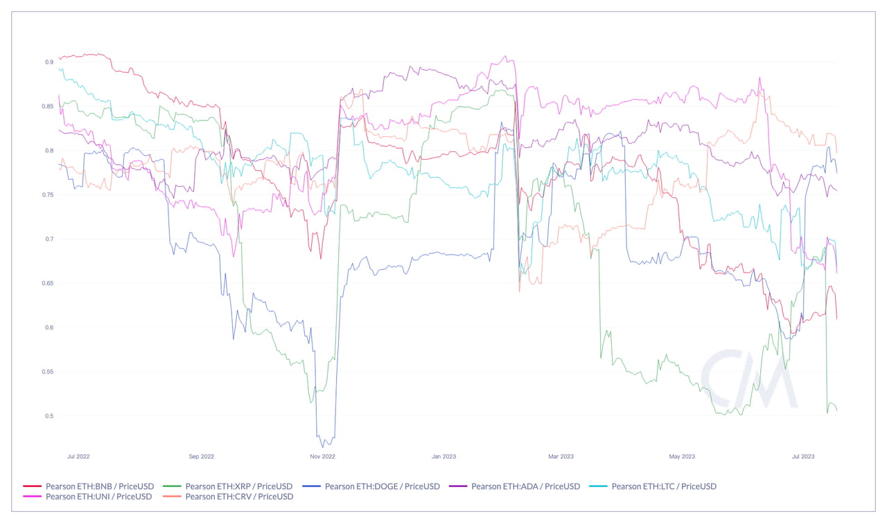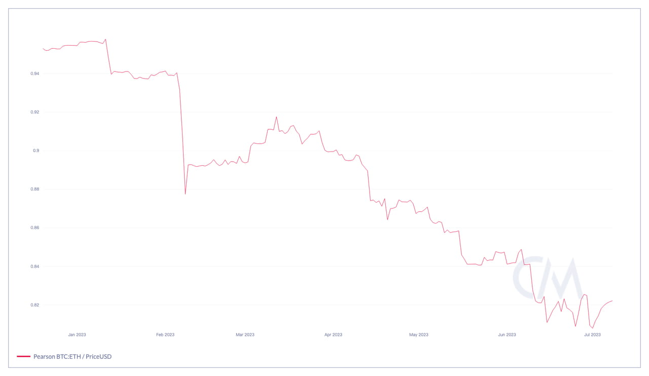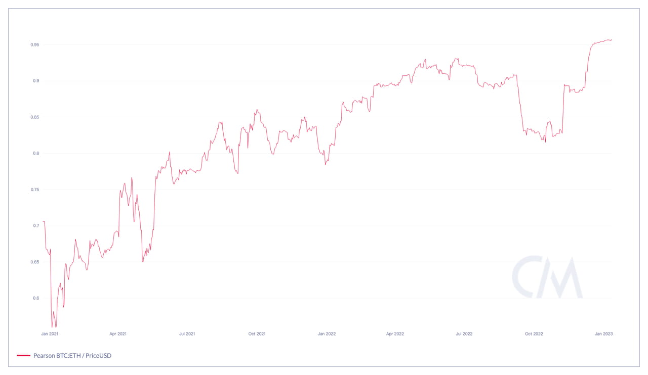 Correlação de preços de 90 dias entre BTC e ETH desde janeiro de 2023. Fonte: CoinMetrics