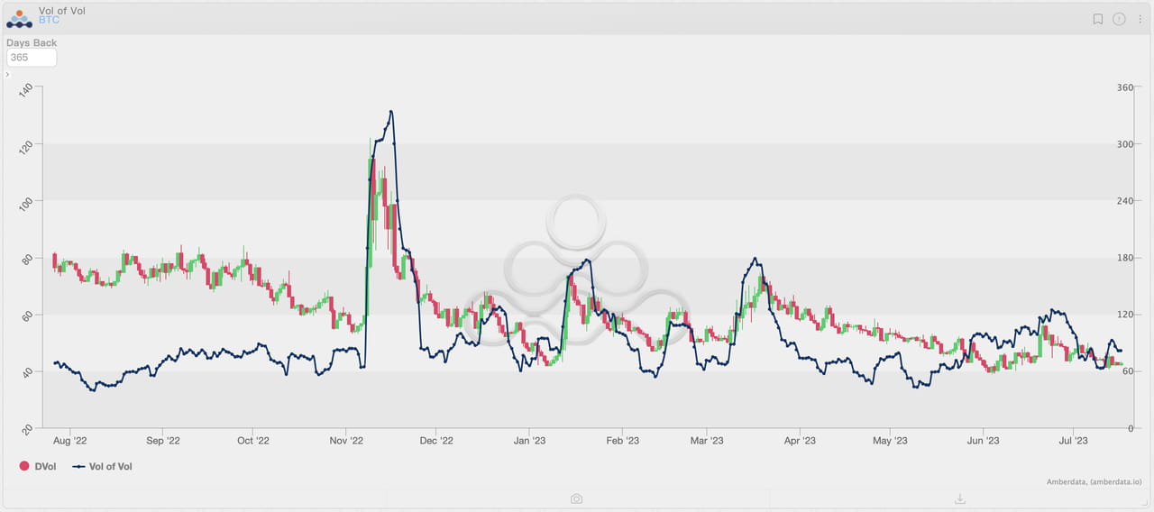 Mudanças no Índice de Volatilidade BTC DVOL e “Volatilidade da Volatilidade” desde agosto de 2022. O volume de vol no BTC se move de forma mais rápida e sensível em comparação com o índice de volatilidade. Fonte: Derivados Amberdata