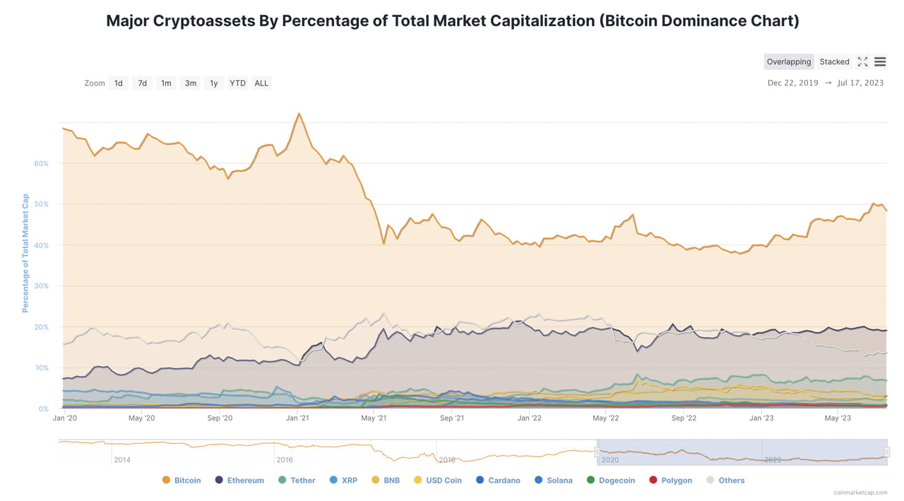 Além disso, a alocação interna de liquidez no mercado criptográfico também afetará o preço e o valor de mercado do BTC. Do início de 2021 ao final de 2022, devido ao impacto do mercado altista e da “temporada alts”, a participação de mercado do BTC diminuiu gradualmente de mais de 60% para entre 40% e 45%. Então, beneficiando-se das compras institucionais e do retorno de liquidez, a participação de mercado do BTC se recuperou a partir de janeiro de 2023. Em julho de 2023, a participação de mercado do BTC era de cerca de 50%.