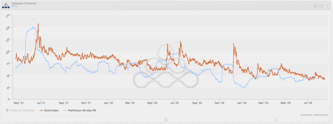Mudanças no Índice de Volatilidade BTC DVOL e níveis de volatilidade realizados desde maio de 2021. Não é difícil descobrir que o Índice de Volatilidade BTC é mais sensível a mudanças macro. Fonte: Derivados Amberdata
