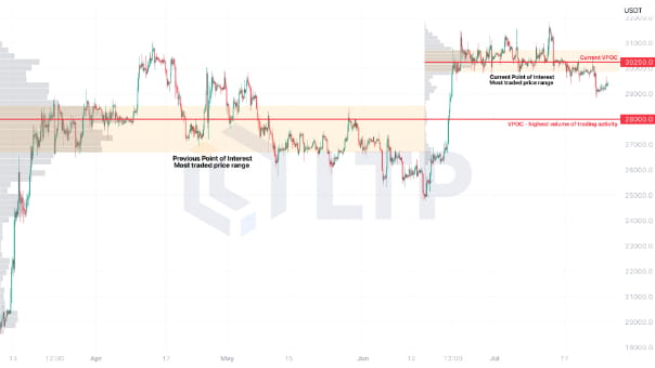 Além disso, o VPOC no segundo trimestre de 2023 em US$ 28.000 é uma indicação significativa do valor justo do Bitcoin, já que esse ponto de preço acumulou o maior volume de negociações entre março e julho. Se o preço do Bitcoin retornasse ao VPOC do segundo trimestre de 2023 em US$ 28.000, podemos esperar ver um aumento nas atividades de negociação e no volume, à medida que o mercado reavalia o valor justo do Bitcoin neste nível. O VPOC representa o ponto de preço com o maior volume de negociação, indicando que um número significativo de participantes do mercado se sente confortável em negociar a esse preço.