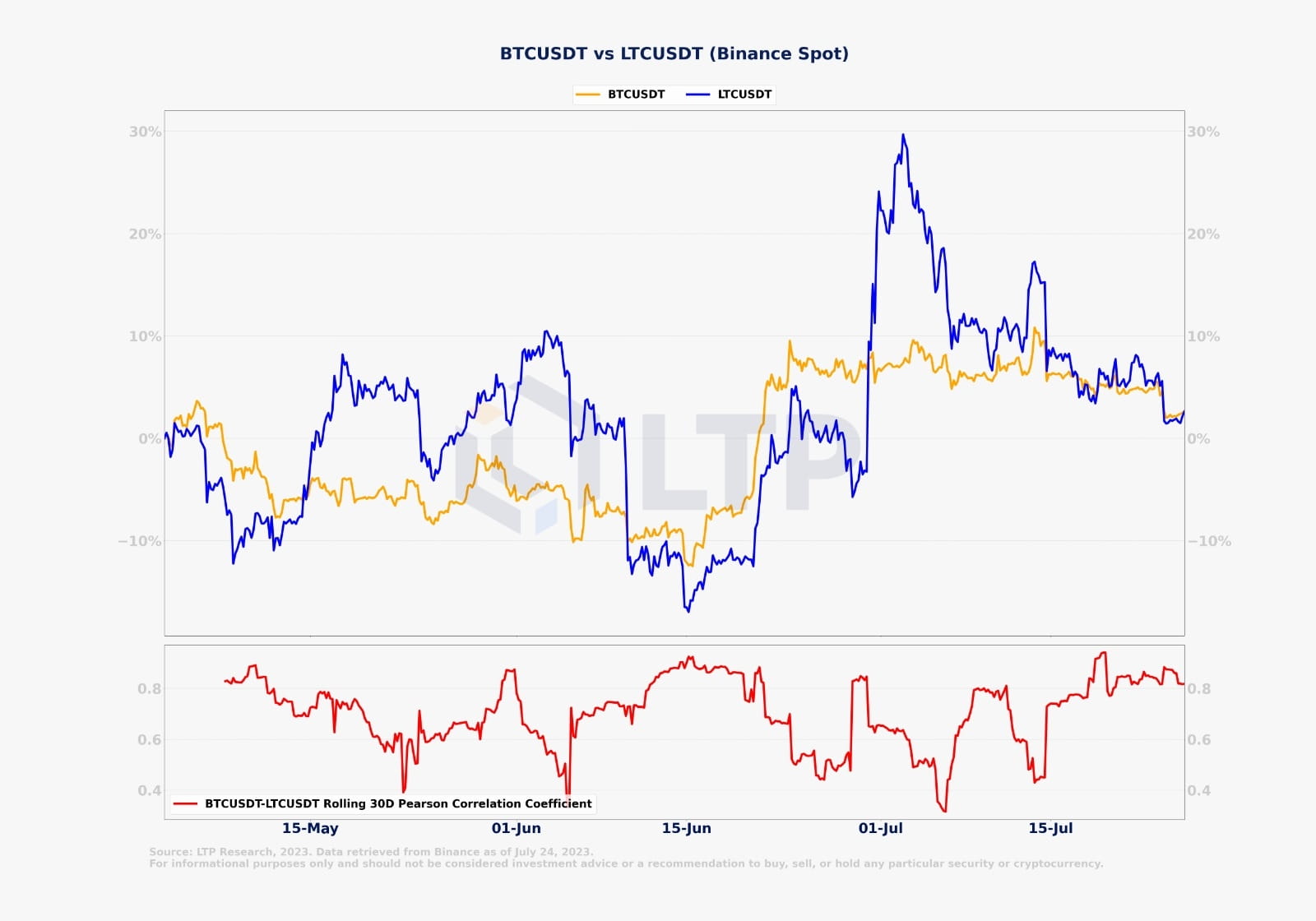 Nos últimos meses, o Litecoin apresentou maior volatilidade, principalmente desde maio, devido à antecipação do seu evento de redução pela metade no início de agosto. Enquanto o Bitcoin permaneceu em uma fase de consolidação prolongada ao longo de julho, as flutuações de preço do Litecoin foram influenciadas pelos movimentos de preço do Bitcoin. Curiosamente, podemos ver que o preço do Litcoin se desvinculou significativamente do do Bitcoin, o que tende a reverter e manter um coeficiente de correlação estável em torno de 0,8. Como resultado, o desvio do preço do Litecoin foi puxado de volta em linha com a ação do preço do Bitcoin.